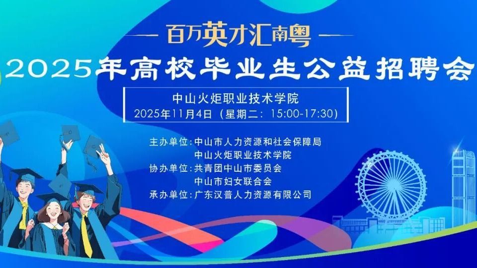 一、主辦單位中山市人力資源和社會保障局中山火炬職業(yè)技術學院二、協(xié)辦單位共青團中山市委員會中山市婦女聯(lián)合會三、承辦單位廣東漢普人力資源有限公司四、時間地點2025年11月4日(星期二:15:00-17:30)地址:中山火炬職業(yè)技術學院體育場五、參會企業(yè)要求1、企業(yè)工商注冊地址為廣東省中山市;2、企業(yè)…