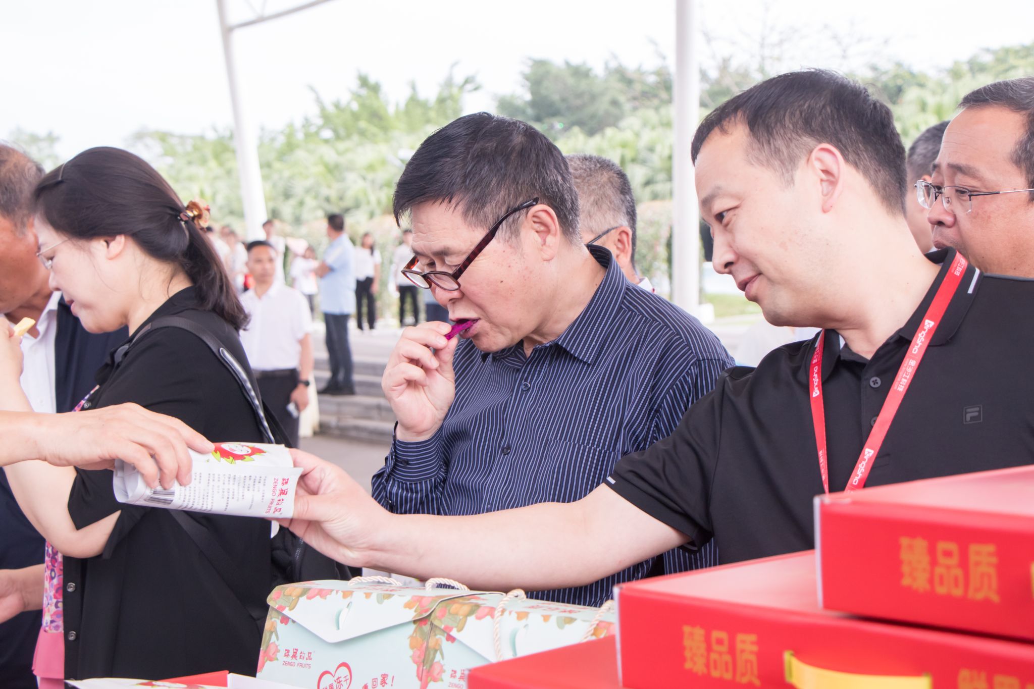【現場參觀考察的領導和嘉賓對我校鄉村振興成果展位非常感興趣,紛紛來到展位前試吃校企研發的火龍果、荔枝等水果凍干】