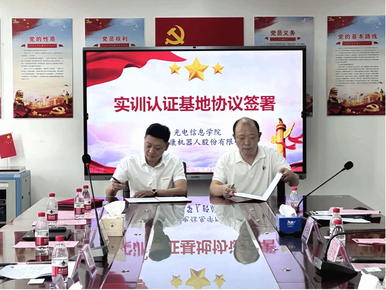 近日,我校光電信息學院與海康機器人股份有限公司共建的“智能機器人產教融合實訓認證基地”揭牌儀式暨黨支部聯建活動在我校光谷樓704會議室舉行。校企雙方就支部聯建、智能移動機器人(AMR)控制、裝調、運維領域人才定向培養與認證體系建設等領域簽署意向協議,共繪“新雙高”周期專業內涵高質量發展新藍圖。