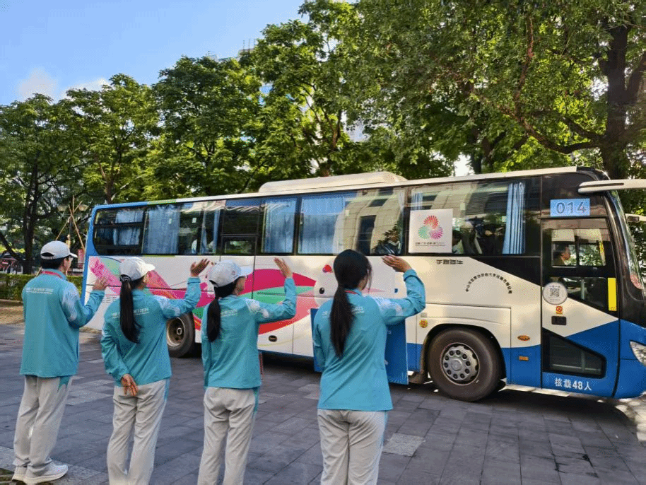 車輛調度區是運動員踏上賽場前的重要一環。志愿者們不僅要提前確認車次信息,更要精準引導、有序組織,確保每一位運動員順利登車、準時出發。