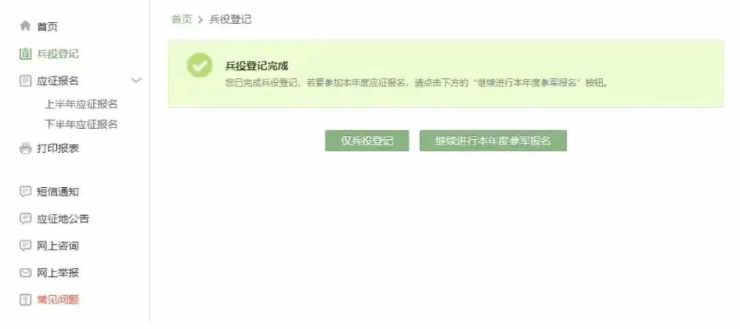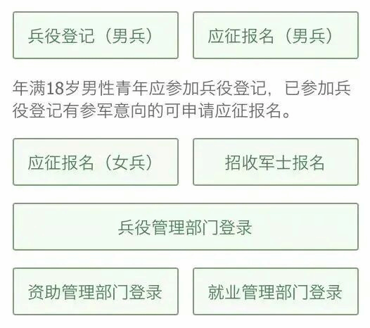 登錄www.gfbzb.gov.cn,點擊“兵役登記(男兵)”進入頁面,進行“兵役登記(男兵)”。女生點擊“應征報名(女兵)”。如果是第一次報名,直接從“兵役登記(男兵)”進入頁面即可,否則就從“應征報名(男兵)”進入頁面;如果想報名直招士官,可從“直招士官報名”進入頁面。