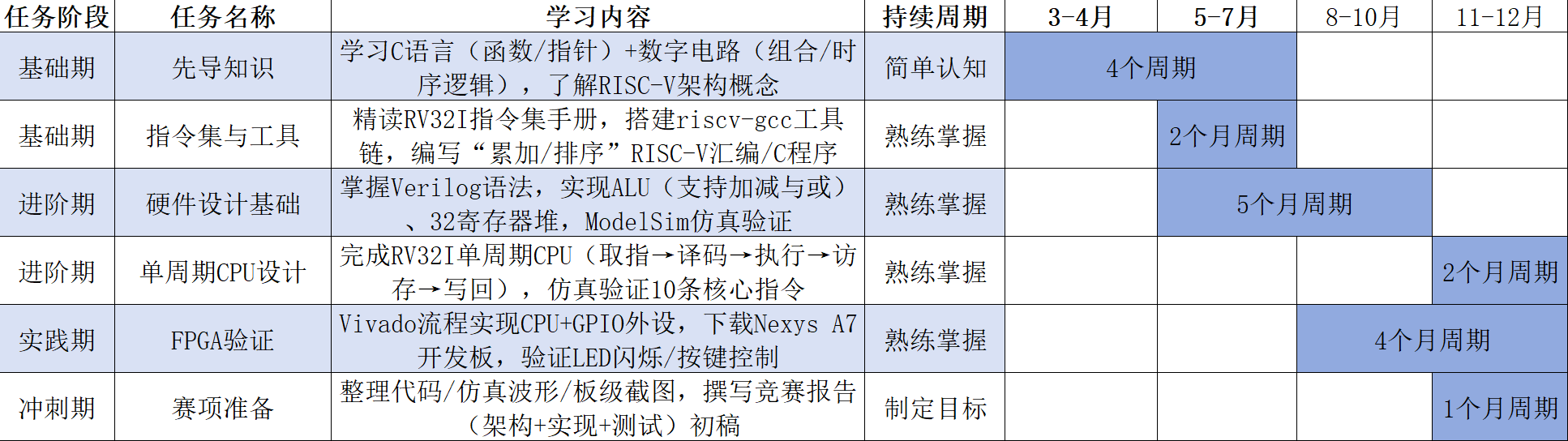 我校光電學子在此次大賽中獲得第六名的好成績,背后是一場為期六個月的“硬核攻堅”。劉振興博士針對賽事“理論20%+實操80%”的考核特點,為學生量身打造了階梯式精英訓練體系:從基礎期的C語言、RISC-V架構入門認知,到指令集工具鏈、Verilog硬件描述語言的熟練掌握,再到進階期單周期CPU設計與仿真、FPGA板級驗證的實操打磨,每個階段都制定了明確的技能達標標準。